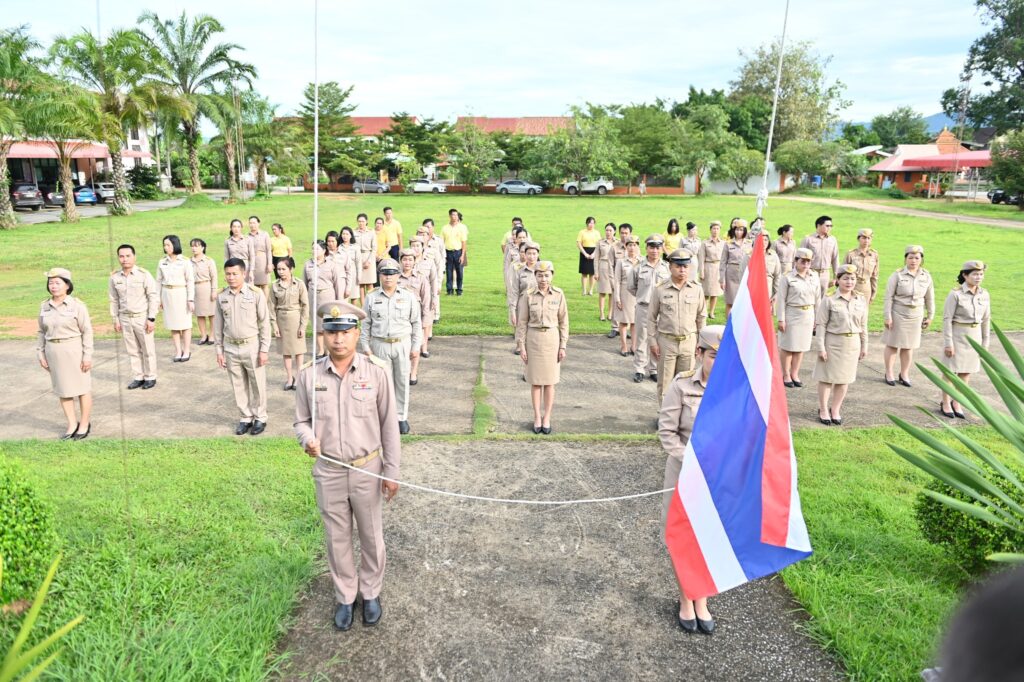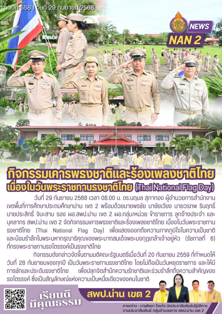 วันที่ 29 กันยายน 2568 เวลา 08.00 น. ดร.นฤมล สุภาทอง ผู้อำนวยการสำนักงานเขตพื้นที่การศึกษาประถมศึกษาน่าน เขต 2 พร้อมด้วยนายพรชัย นาชัยเวียง นายวรภพ รินฤทธิ์ นายประสิทธิ์ จินะสาม รอง ผอ.สพป.น่าน เขต 2 ผอ.กลุ่ม/หน่วย ข้าราชการ ลูกจ้างประจำ และบุคลากร สพป.น่าน เขต 2 จัดกิจกรรมเคารพธงชาติและร้องเพลงชาติไทย เนื่องในวันพระราชทานธงชาติไทย (Thai National Flag Day) เพื่อแสดงออกถึงความภาคภูมิใจในความเป็นชาติ และร่วมน้อมรำลึกในพระมหากรุณาธิคุณของพระบาทสมเด็จพระมงกุฎเกล้าเจ้าอยู่หัว ที่ทรงพระราชทานธงไตรรงค์เป็นธงชาติไทย