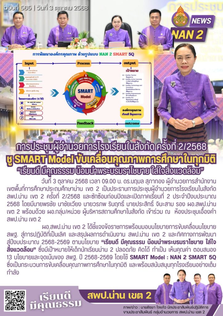 โดย ผอ.สพป.น่าน เขต 2 ได้ชี้แจงข้อราชการพร้อมมอบนโยบายการขับเคลื่อนนโยบาย สพฐ. สู่การปฏิบัติที่เป็นเลิศและสรุปผลการดำเนินงาน สพป.น่าน เขต 2 และทิศทางการพัฒนาสู่ ปีงบประมาณ 2568-2569 ตามนโยบาย “เรียนดี มีคุณธรรม น้อมนำพระบรมราโชบาย ใส่ใจสิ่งแวดล้อม” ซึ่งมีเป้าหมายให้เด็กนักเรียนน่าน 2 ปลอดภัย คิดได้ ทำเป็น เห็นคุณค่า ตอบสนอง 13 นโยบายและจุดเน้นของ สพฐ. ปี 2568-2569 โดยใช้ SMART Model : NAN 2 SMART 5Q ซึ่งเป็นกระบวนการขับเคลื่อนคุณภาพการศึกษาในทุกมิติ และพร้อมสนับสนุนทุกโรงเรียนอย่างเต็มกำลัง