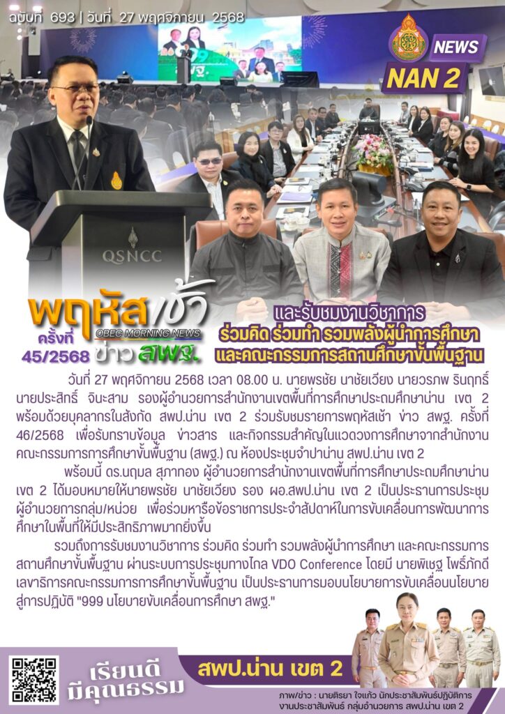 วันที่ 27 พฤศจิกายน 2568 เวลา 08.00 น. นายพรชัย นาชัยเวียง นายวรภพ รินฤทธิ์ นายประสิทธิ์ จินะสาม รองผู้อำนวยการสำนักงานเขตพื้นที่การศึกษาประถมศึกษาน่าน เขต 2 พร้อมด้วยบุคลากรในสังกัด สพป.น่าน เขต 2 ร่วมรับชมรายการพฤหัสเช้า ข่าว สพฐ. ครั้งที่ 46/2568 เพื่อรับทราบข้อมูล ข่าวสาร และกิจกรรมสำคัญในแวดวงการศึกษาจากสำนักงานคณะกรรมการการศึกษาขั้นพื้นฐาน (สพฐ.) ณ ห้องประชุมจำปาน่าน สพป.น่าน เขต 2