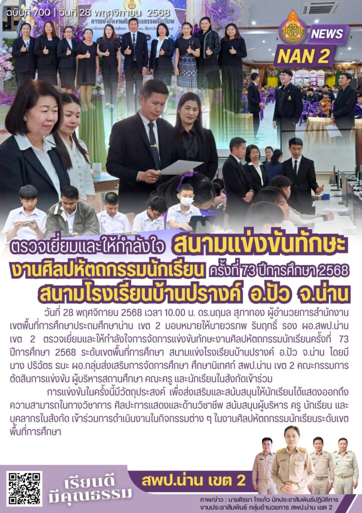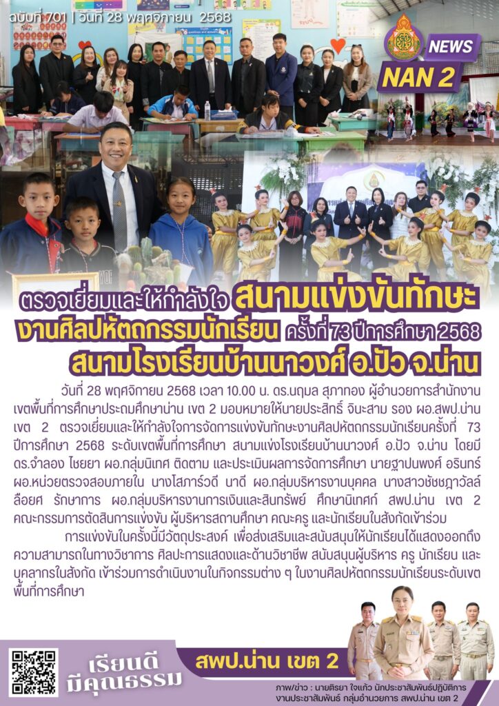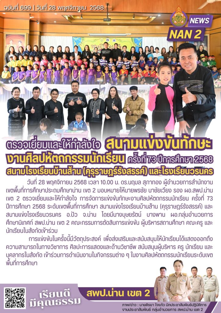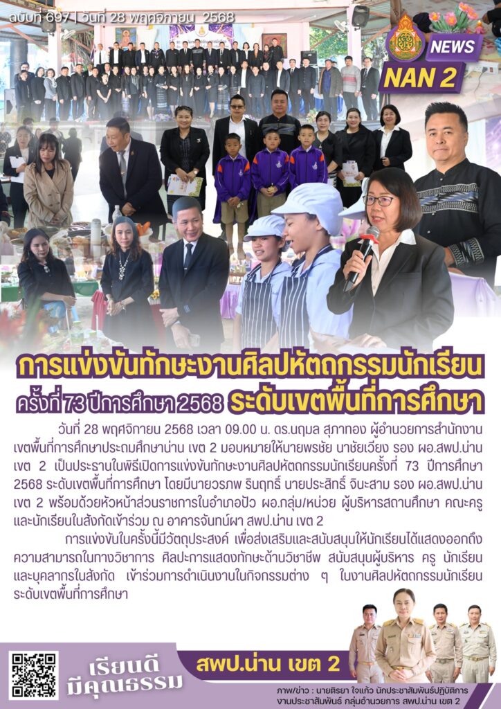 วันที่ 28 พฤศจิกายน 2568 เวลา 09.00 น. ดร.นฤมล สุภาทอง ผู้อำนวยการสำนักงานเขตพื้นที่การศึกษาประถมศึกษาน่าน เขต 2 มอบหมายให้นายพรชัย นาชัยเวียง รอง ผอ.สพป.น่าน เขต 2 เป็นประธานในพิธีเปิดการแข่งขันทักษะงานศิลปหัตถกรรมนักเรียนครั้งที่ 73 ปีการศึกษา 2568 ระดับเขตพื้นที่การศึกษา โดยมีนายวรภพ รินฤทธิ์ นายประสิทธิ์ จินะสาม รอง ผอ.สพป.น่าน เขต 2 พร้อมด้วยหัวหน้าส่วนราชการในอำเภอปัว ผอ.กลุ่ม/หน่วย ผู้บริหารสถานศึกษา คณะครู และนักเรียนในสังกัดเข้าร่วม ณ อาคารจันทน์ผา สพป.น่าน เขต 2