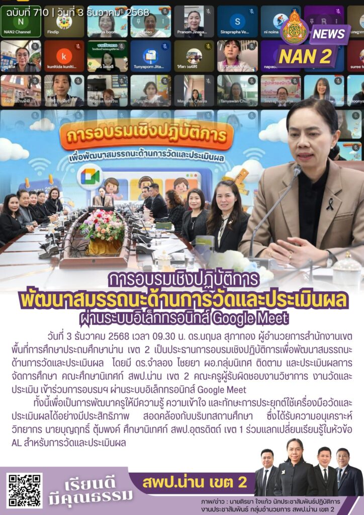 วันที่ 3 ธันวาคม 2568 เวลา 09.30 น. ดร.นฤมล สุภาทอง ผู้อำนวยการสำนักงานเขตพื้นที่การศึกษาประถมศึกษาน่าน เขต 2 เป็นประธานการอบรมเชิงปฏิบัติการเพื่อพัฒนาสมรรถนะด้านการวัดและประเมินผล โดยมี ดร.จำลอง ไชยยา ผอ.กลุ่มนิเทศ ติดตาม และประเมินผลการจัดการศึกษา คณะศึกษานิเทศก์ สพป.น่าน เขต 2 คณะครูผู้รับผิดชอบงานวิชาการ งานวัดและประเมิน เข้าร่วมการอบรมฯ ผ่านระบบอิเล็กทรอนิกส์ Google Meet