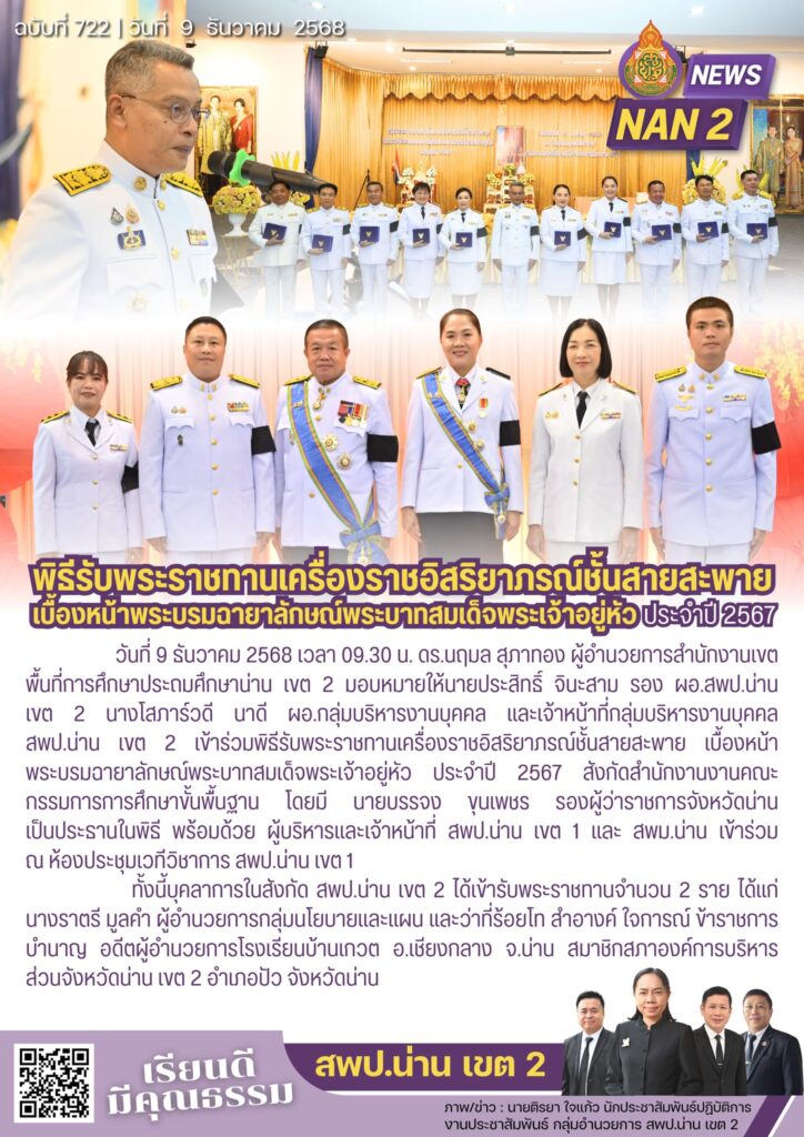 วันที่ 9 ธันวาคม 2568 เวลา 09.30 น. ดร.นฤมล สุภาทอง ผู้อำนวยการสำนักงานเขตพื้นที่การศึกษาประถมศึกษาน่าน เขต 2 มอบหมายให้นายประสิทธิ์ จินะสาม รอง ผอ.สพป.น่าน เขต 2 นางโสภาร์วดี นาดี ผอ.กลุ่มบริหารงานบุคคล และเจ้าหน้าที่กลุ่มบริหารงานบุคคล สพป.น่าน เขต 2 เข้าร่วมพิธีรับพระราชทานเครื่องราชอิสริยาภรณ์ชั้นสายสะพาย เบื้องหน้าพระบรมฉายาลักษณ์พระบาทสมเด็จพระเจ้าอยู่หัว ประจำปี 2567 สังกัดสำนักงานงานคณะกรรมการการศึกษาขั้นพื้นฐาน โดยมี นายบรรจง ขุนเพชร รองผู้ว่าราชการจังหวัดน่าน เป็นประธานในพิธี พร้อมด้วย ผู้บริหารและเจ้าหน้าที่ สพป.น่าน เขต 1 และ สพม.น่าน เข้าร่วม ณ ห้องประชุมเวทีวิชาการ สพป.น่าน เขต 1